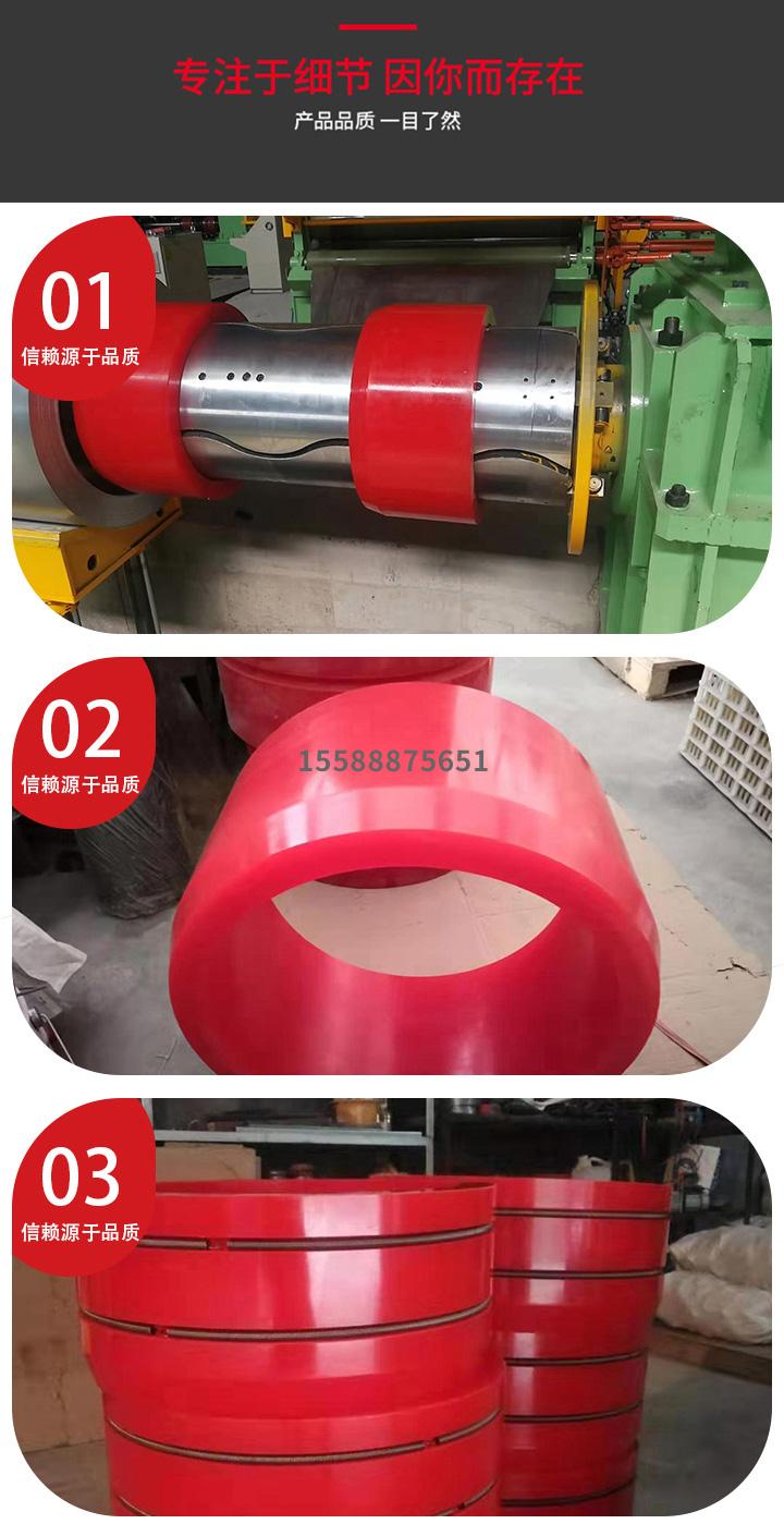 鋼卷內(nèi)徑610mm變760mm上料開放卷聚氨酯增徑套 鋼卷內(nèi)徑由610增大到760所用的開卷機(jī)增徑膠套,根據(jù)開卷機(jī)自己卷筒尺寸,做了很好的配合,可以快速解決鋼卷內(nèi)徑變換的問(wèn)題,避免了鐵制墊圈的弊端,使用方便,增徑效果好,具體尺寸可詢15588875651為您解答! ![]() ![]() ![]()